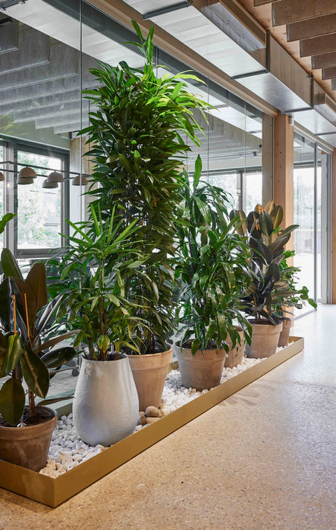 De groene laag in het gebouw speelt hierbij een belangrijke rol en verbindt de verschillende etages en ruimten met elkaar. In alle zichtlijnen ontmoet je het groen en geeft het een extra geborgen gevoel. Voor de plantenkeuze hebben we ons laten inspireren door het natuurlijke groen in de omgeving zodat het klopt met de plek en de visie van BBN.